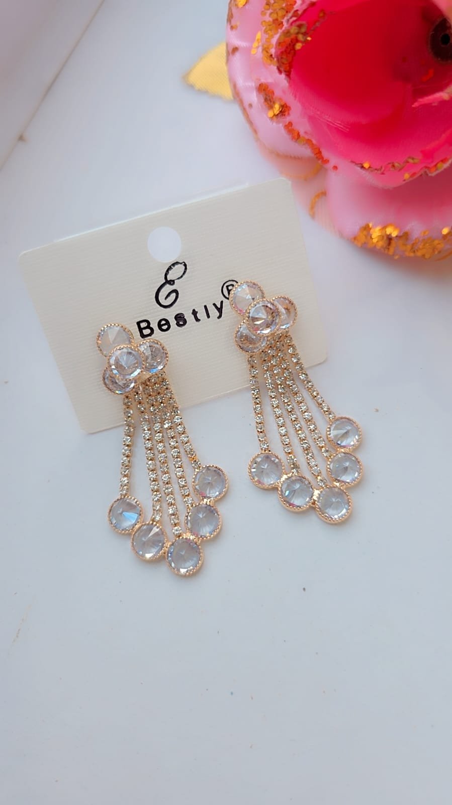 Add a touch of glamour to your look with our Elegant Crystal Dangling Earrings. These earrings feature a delicate floral design at the top, followed by cascading chains embellished with sparkling crystal stones, giving them a chic and classy vibe.