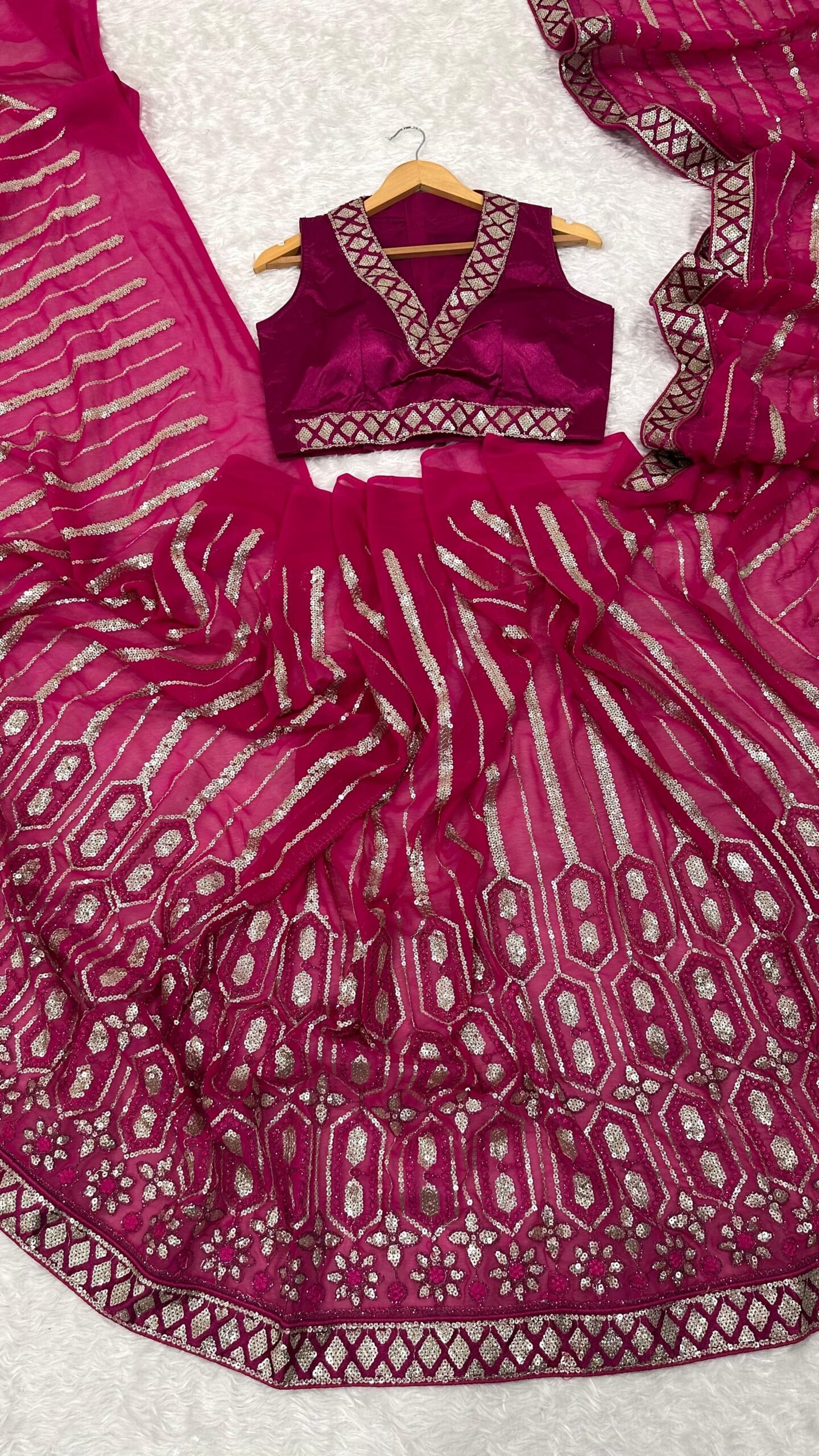 This exquisite saree is beautifully crafted in soft georgette fabric, highlighted with intricate sequin, thread, and dori work that catches every light. The vibrant fuchsia pink hue enhances your look, making it perfect for weddings, receptions, cocktail nights, and festive occasions.