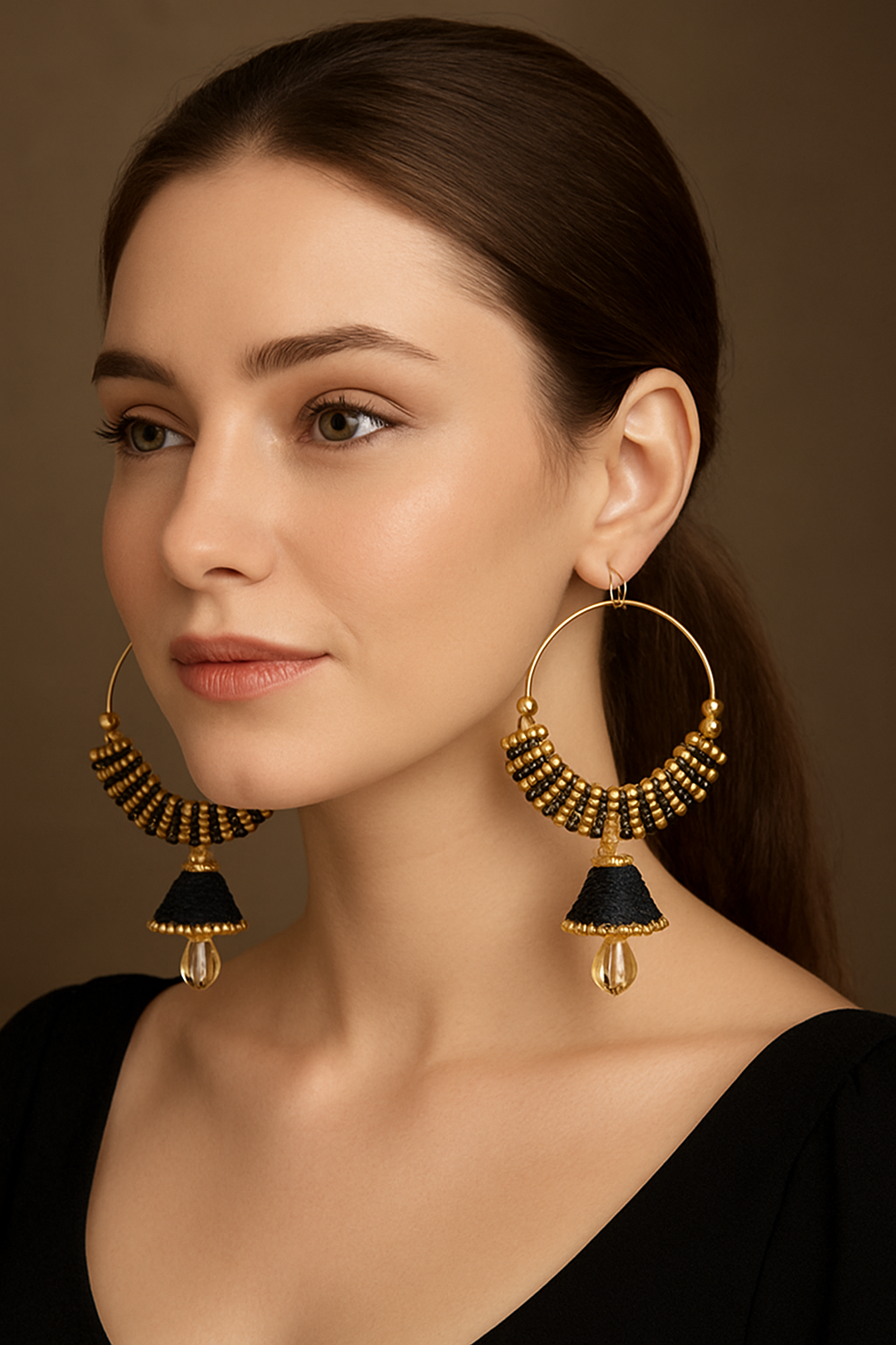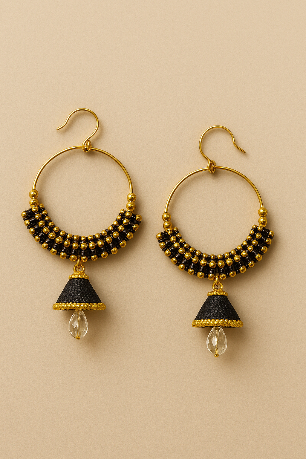 Enhance your ethnic and western outfits with these Gold Plated Black Beads Hoop Earrings. Designed with intricate black bead work, jhumka-style danglers, and a sparkling crystal drop, these earrings add elegance to any look.