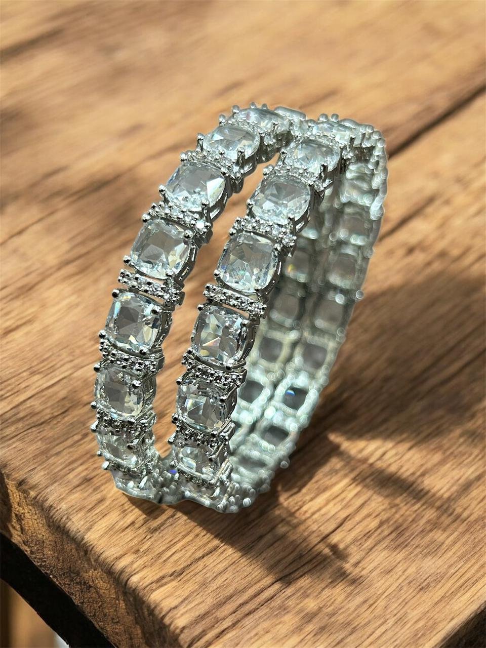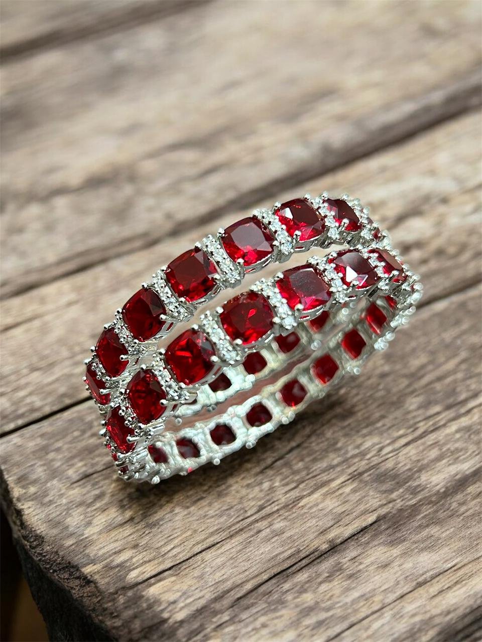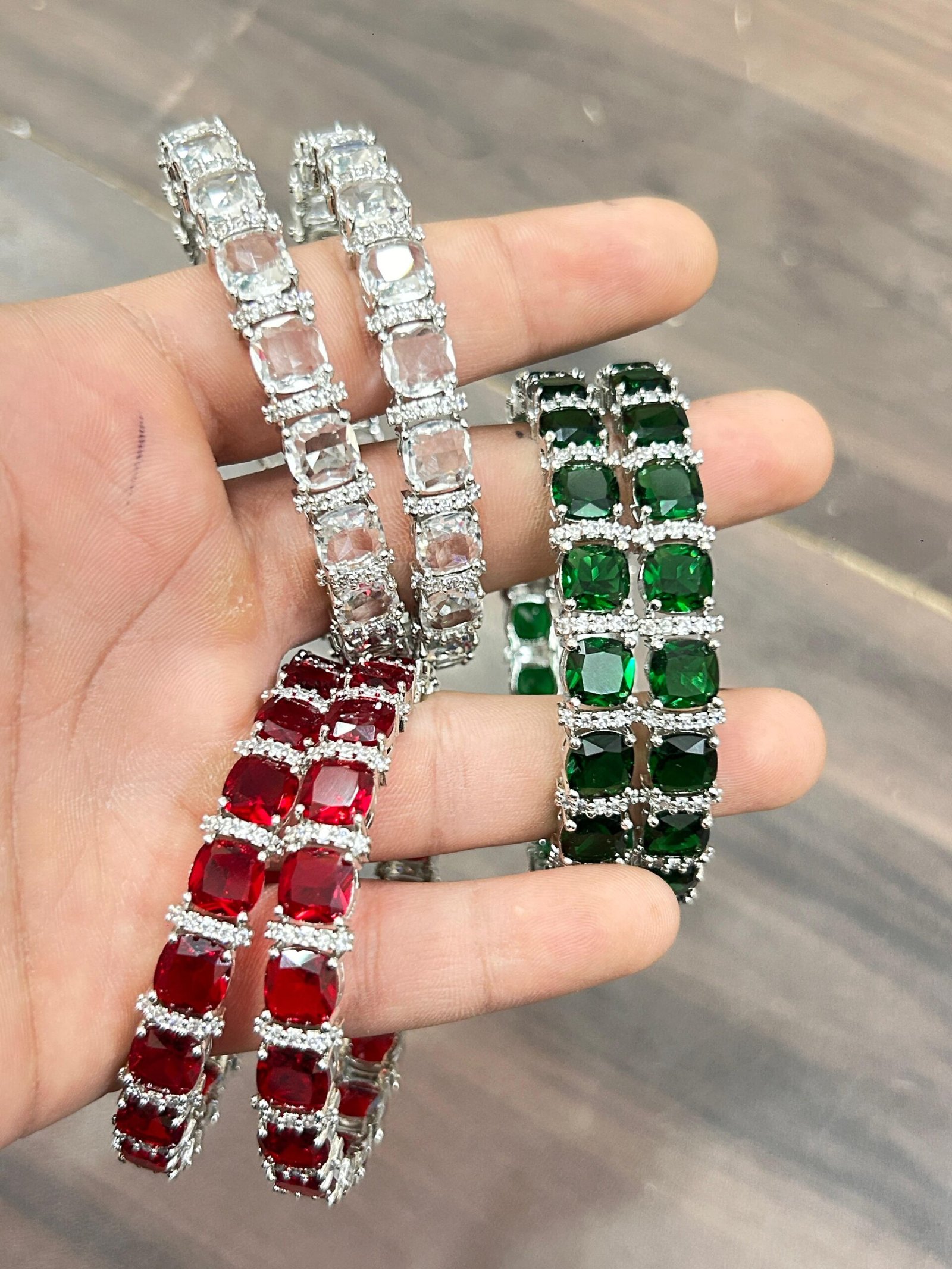 Premium crystal-studded bangle set available in Green, Red, and White colors. Elegant silver-plated design, perfect for weddings, parties, and festive wear.