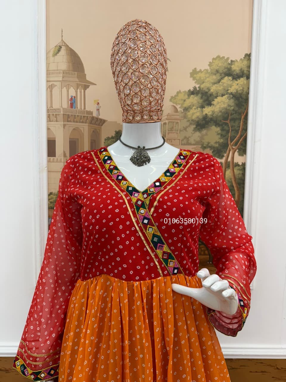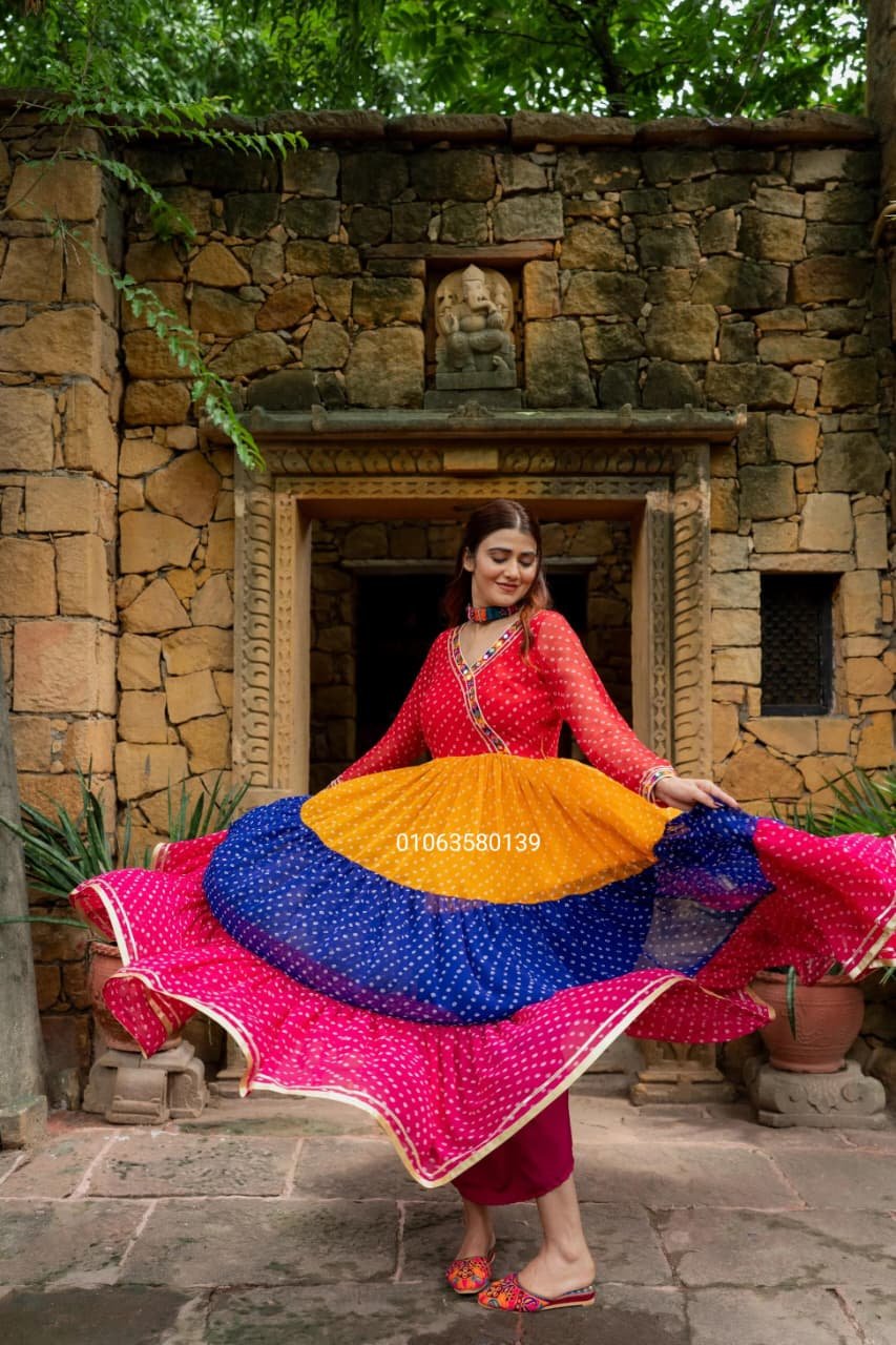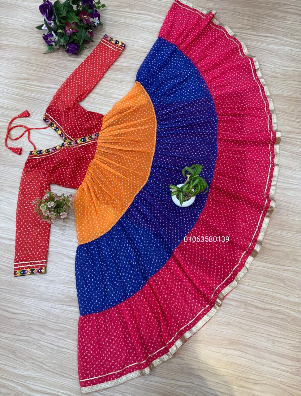 The gown features embroidered lace borders with real mirror detailing that add a touch of sparkle and authenticity. With its three-layer ruffle design and 7-meter flair, it ensures a graceful and flowy silhouette. The vibrant red, orange, blue, and pink panels bring a playful yet regal vibe, making it the perfect outfit for traditional gatherings.