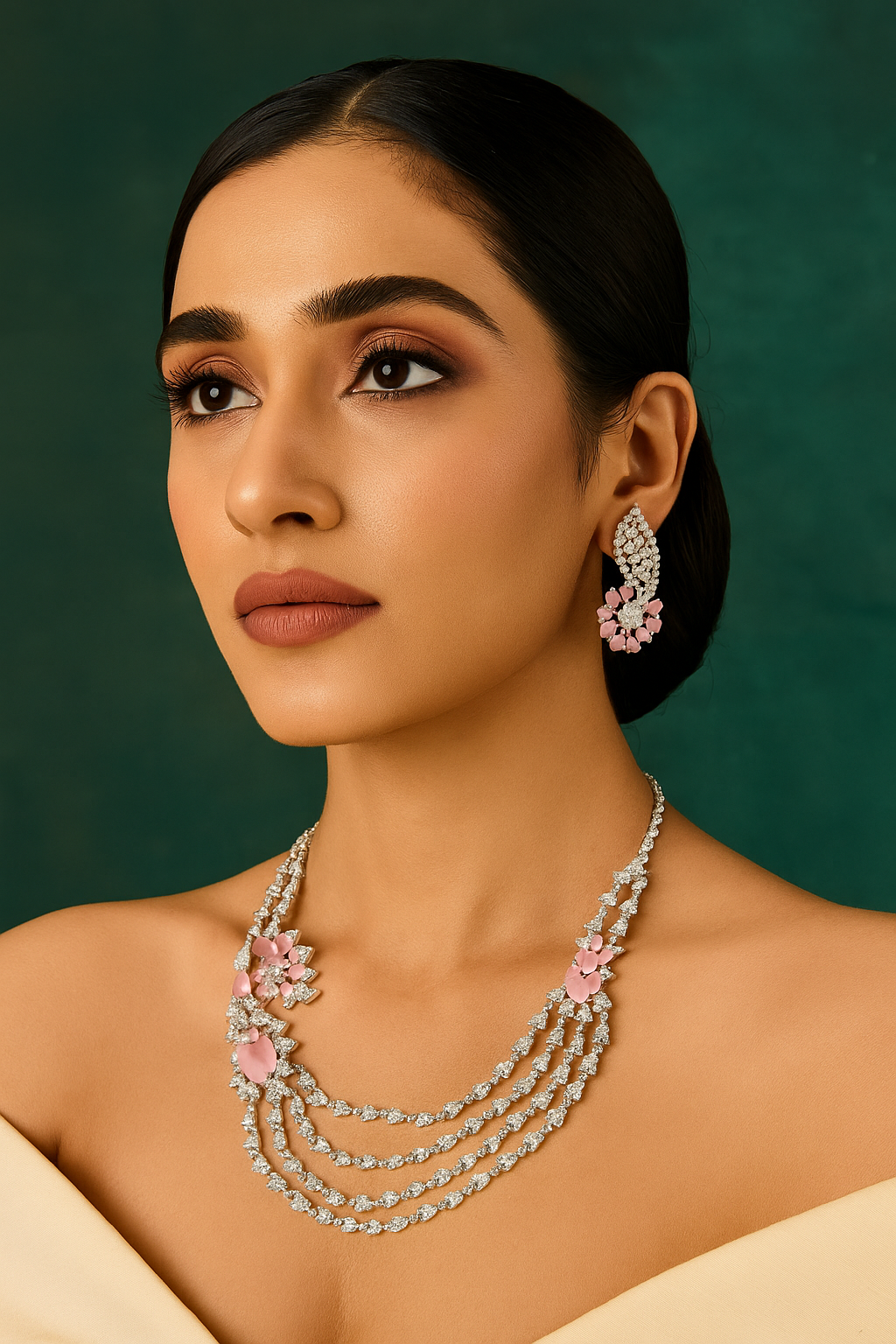 A luxurious bridal necklace set studded with sparkling American Diamonds and pink stones. Perfect for weddings, parties, engagements, and festive occasions.