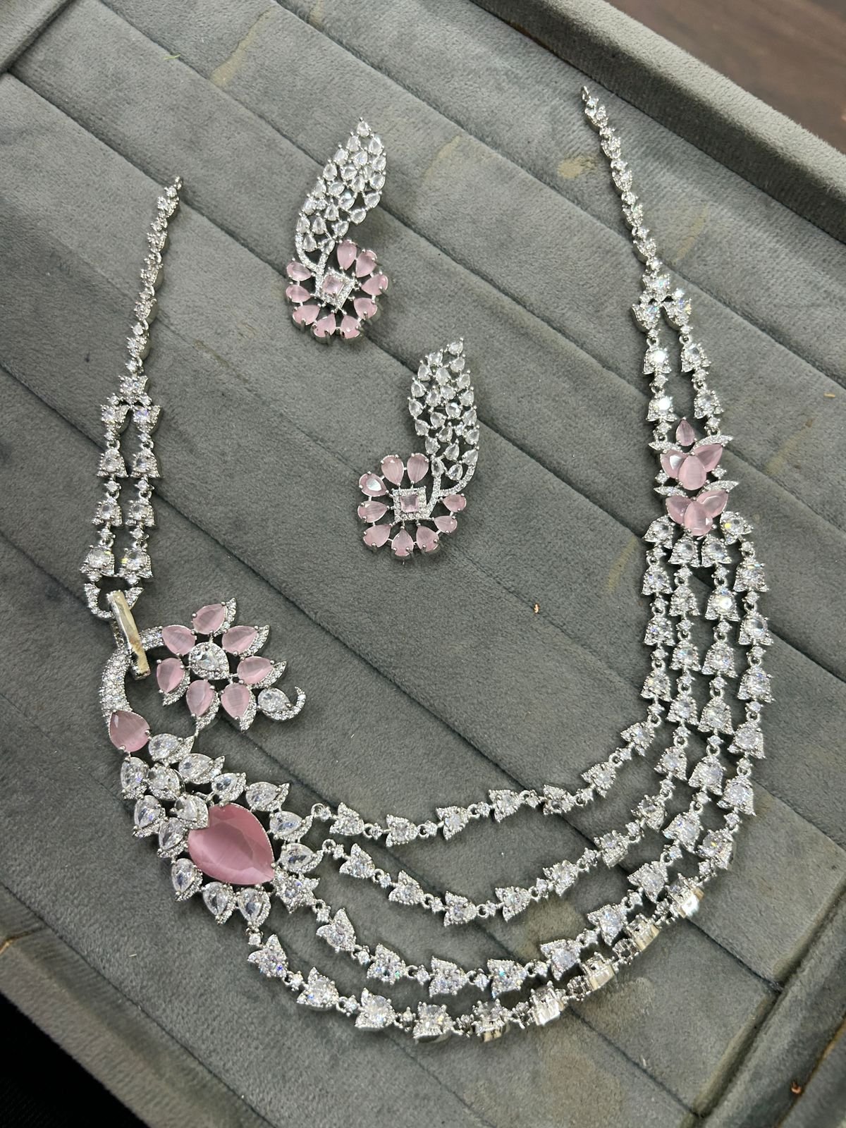 Elevate your style with this stunning Premium Necklace Set, crafted with high-quality silver plating and embellished with sparkling American Diamonds (CZ) and elegant pink stones. The three-layered diamond-cut chain with floral motif design makes it an ideal choice for weddings, engagements, festivals, and special parties. Paired with beautifully matching earrings, this set blends traditional elegance with a modern touch, ensuring you look radiant on every occasion.