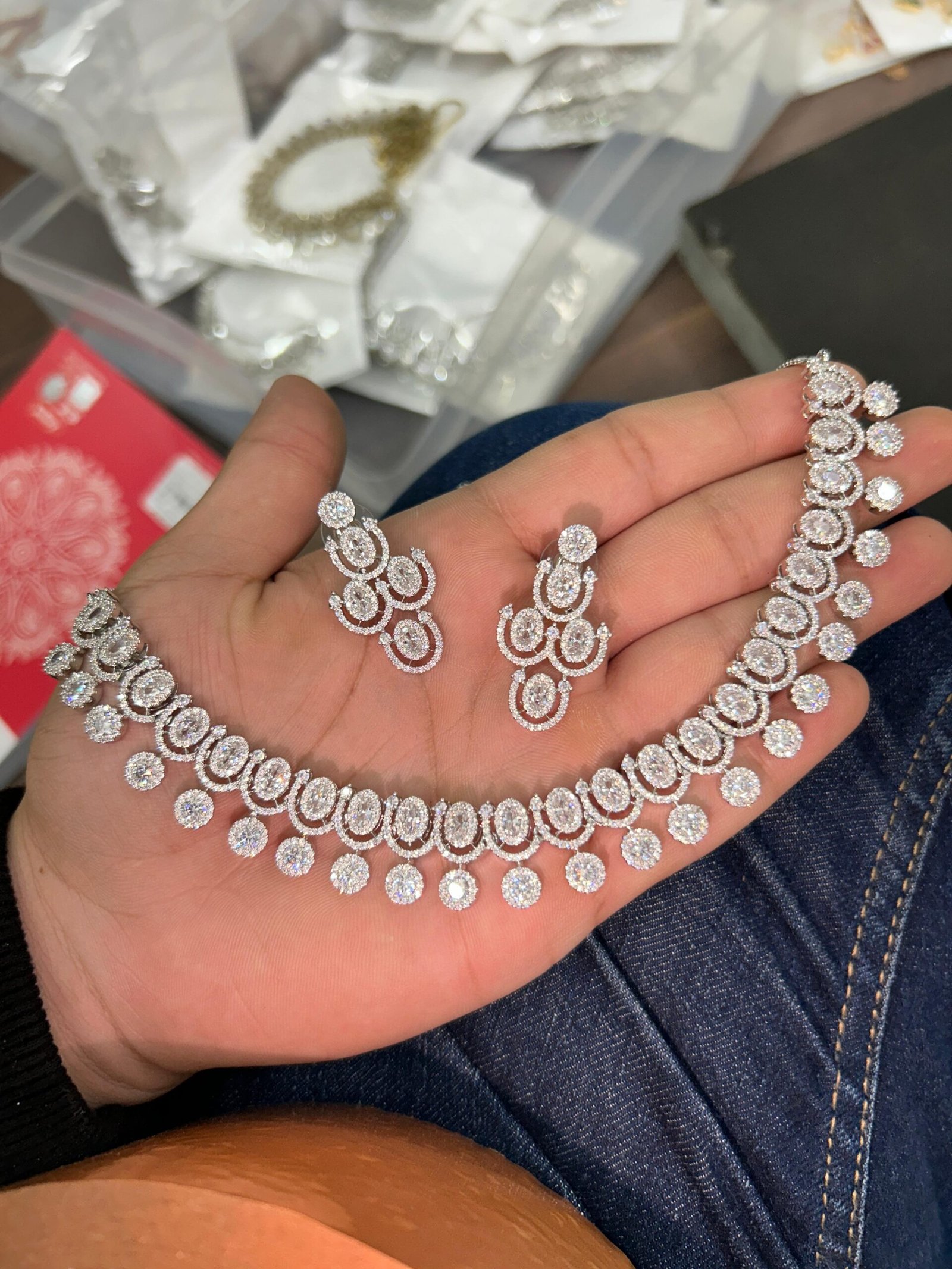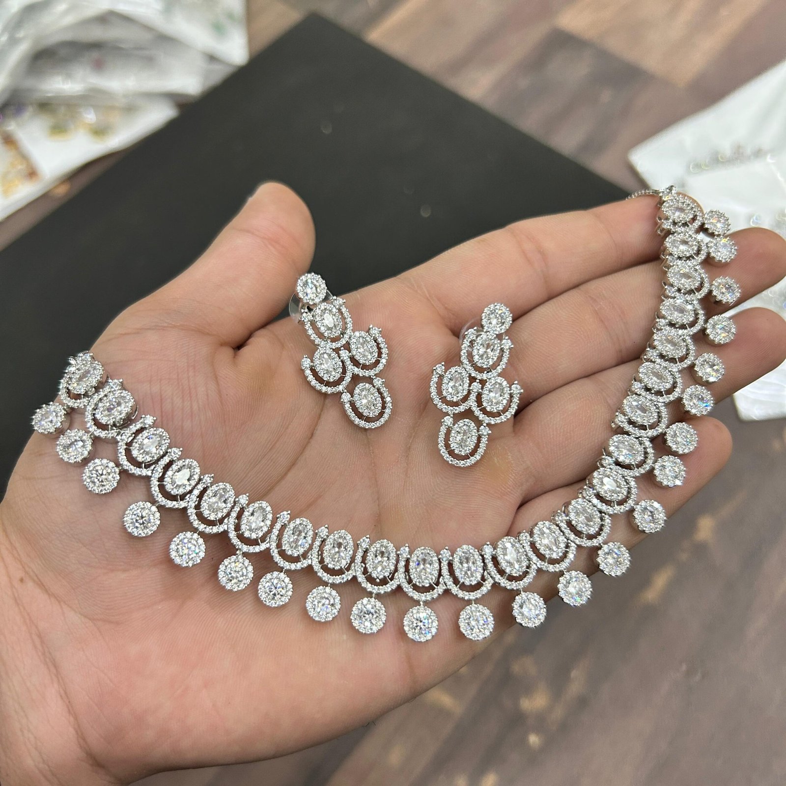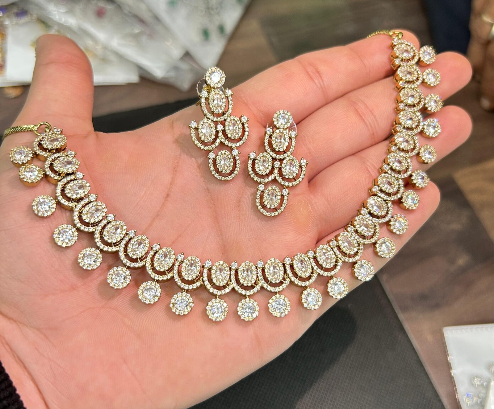 Elevate your style with our Radiant Elegance Diamond Choker Set, designed to make you shine on every special occasion. This exquisite jewellery set features a beautifully handcrafted choker-style necklace, adorned with dazzling oval and round-cut stones, giving it a luxurious brilliance. The matching earrings complement the necklace perfectly, making it an ideal choice for brides, bridesmaids, and anyone who loves sophisticated glamour.