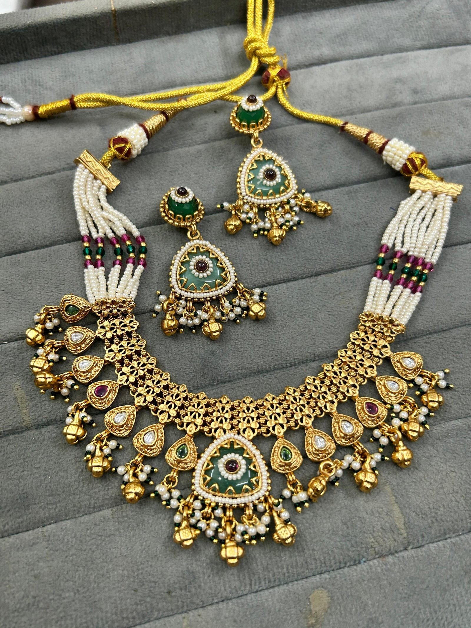 This exquisite Royal Kundan & Pearl Choker Necklace Set is crafted to enhance your bridal and festive attire. The necklace features a wide choker-style base adorned with kundan stones, meenakari green center motifs, pearls, and golden danglers for a grand ethnic charm. Each element is carefully designed to reflect traditional artistry with a modern touch.
