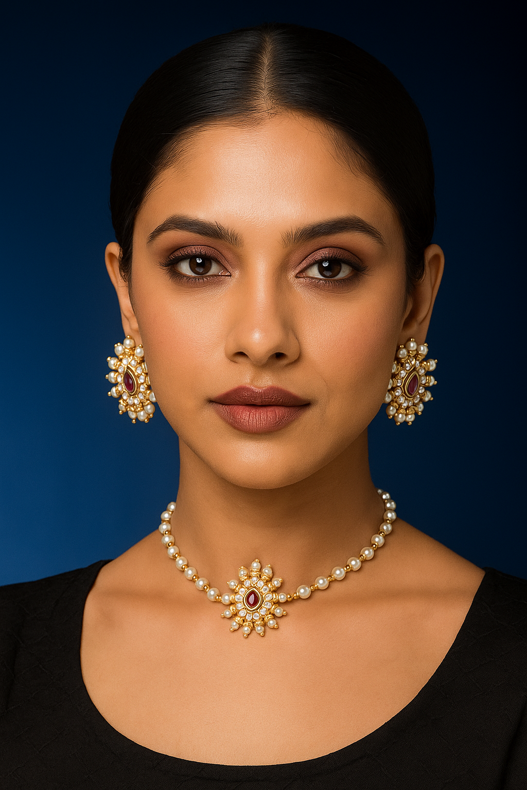 Elevate your traditional look with this exquisite Royal Pearl & Ruby Choker Set, designed to reflect regal charm and sophistication. The choker features a beautifully crafted centerpiece adorned with a teardrop-shaped ruby red stone, surrounded by sparkling white stones and delicate pearl embellishments. The necklace is complemented with a string of pearls that enhances its luxurious appeal.