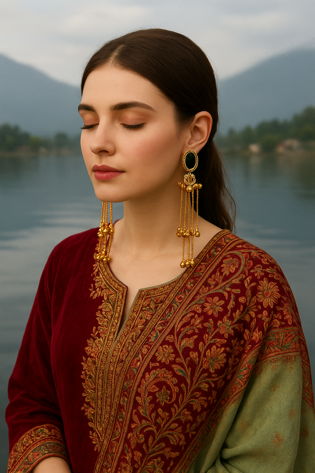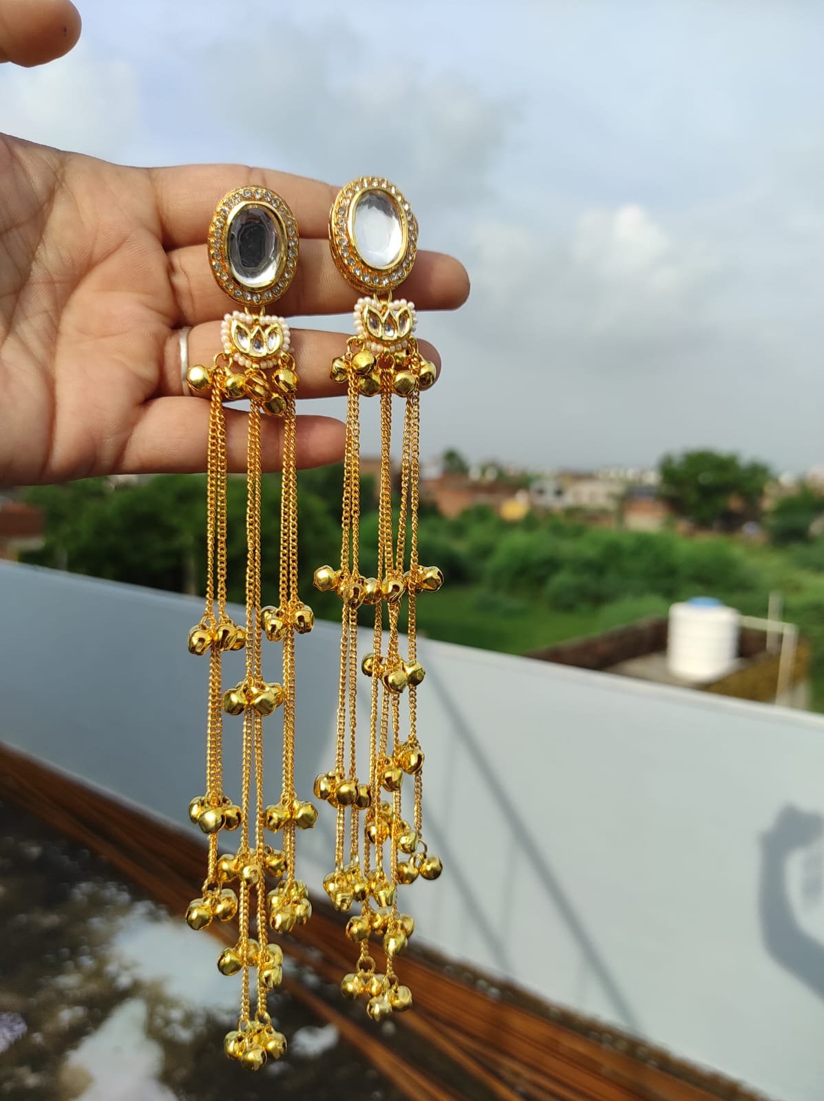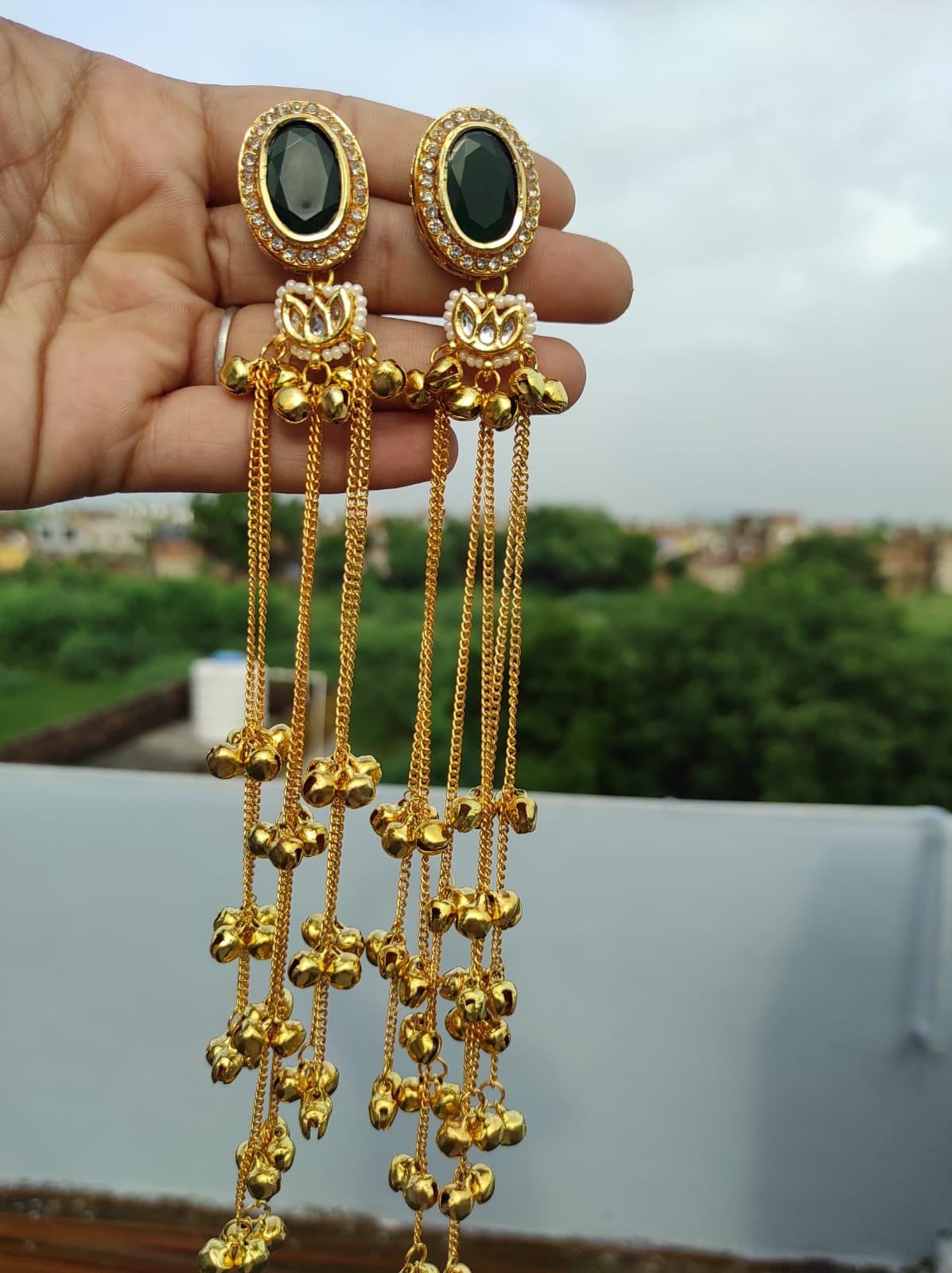 Celebrate the elegance of Kashmiri craftsmanship with these stunning traditional long jhumka earrings. Featuring a striking ruby red stone surrounded by shimmering crystals, the earrings cascade into multiple golden chains embellished with ghungroos, creating a rich ethnic charm. Known for their regal length and intricate design, Kashmiri earrings are a must-have for weddings, festive occasions, and cultural celebrations. These statement earrings blend tradition with glamour, making them the perfect accessory to complement sarees, lehengas, and ethnic attire.