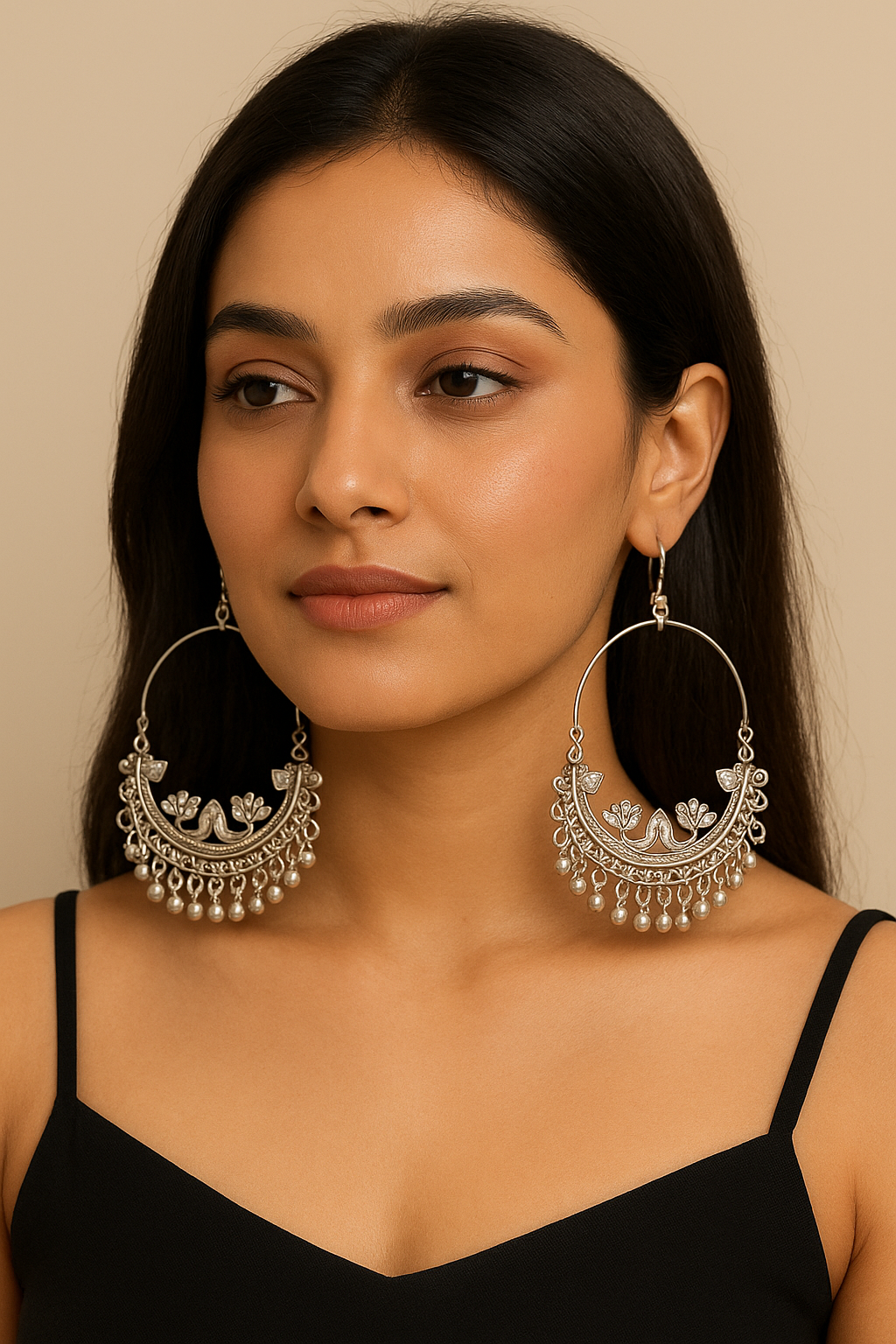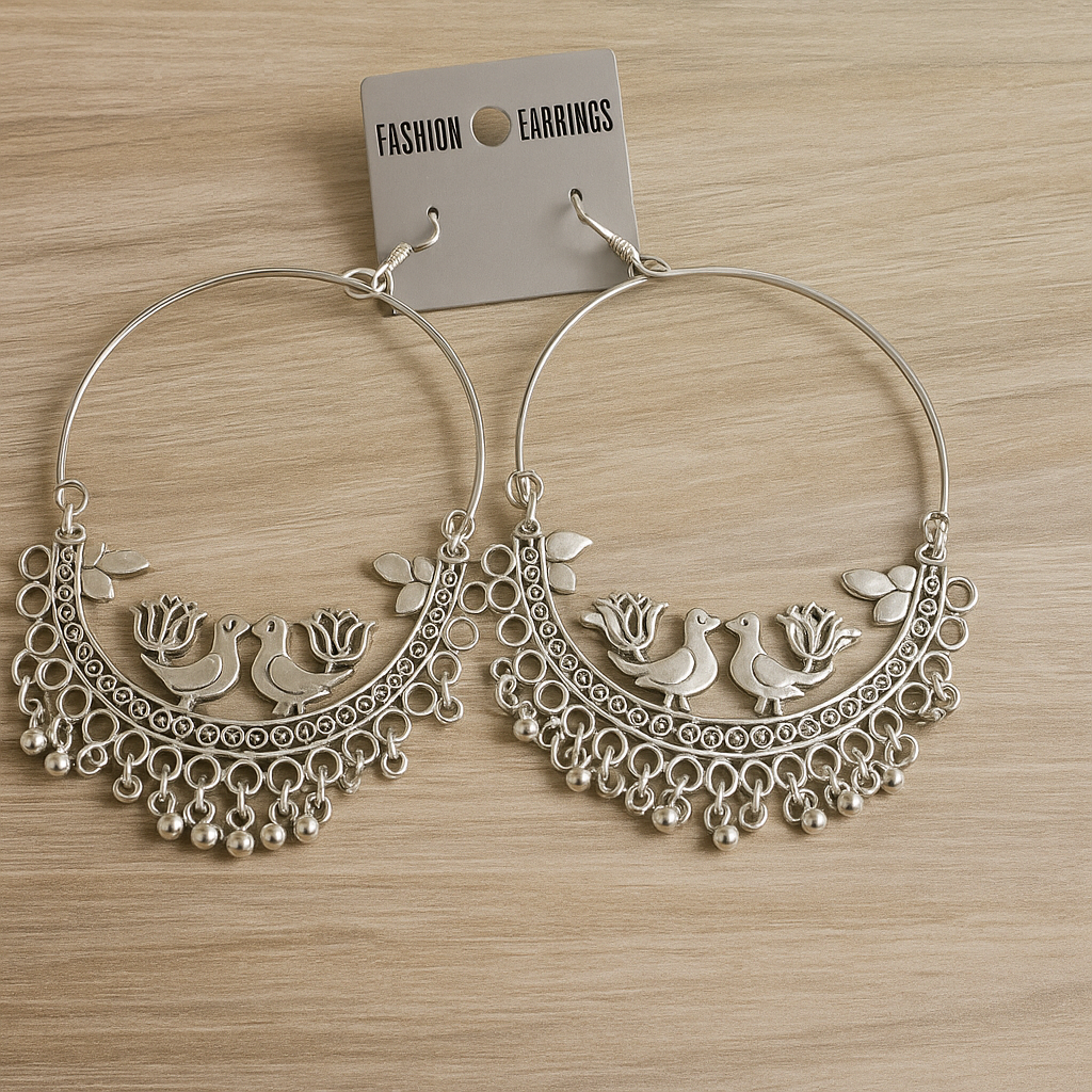 Elevate your style with these Trendy Oxidised Silver Bird & Floral Hoop Earrings designed for modern women and girls who love ethnic charm with a contemporary twist. Crafted from high-quality oxidised metal, these earrings feature an intricate bird and floral motif with hanging beads that enhance their elegance.
